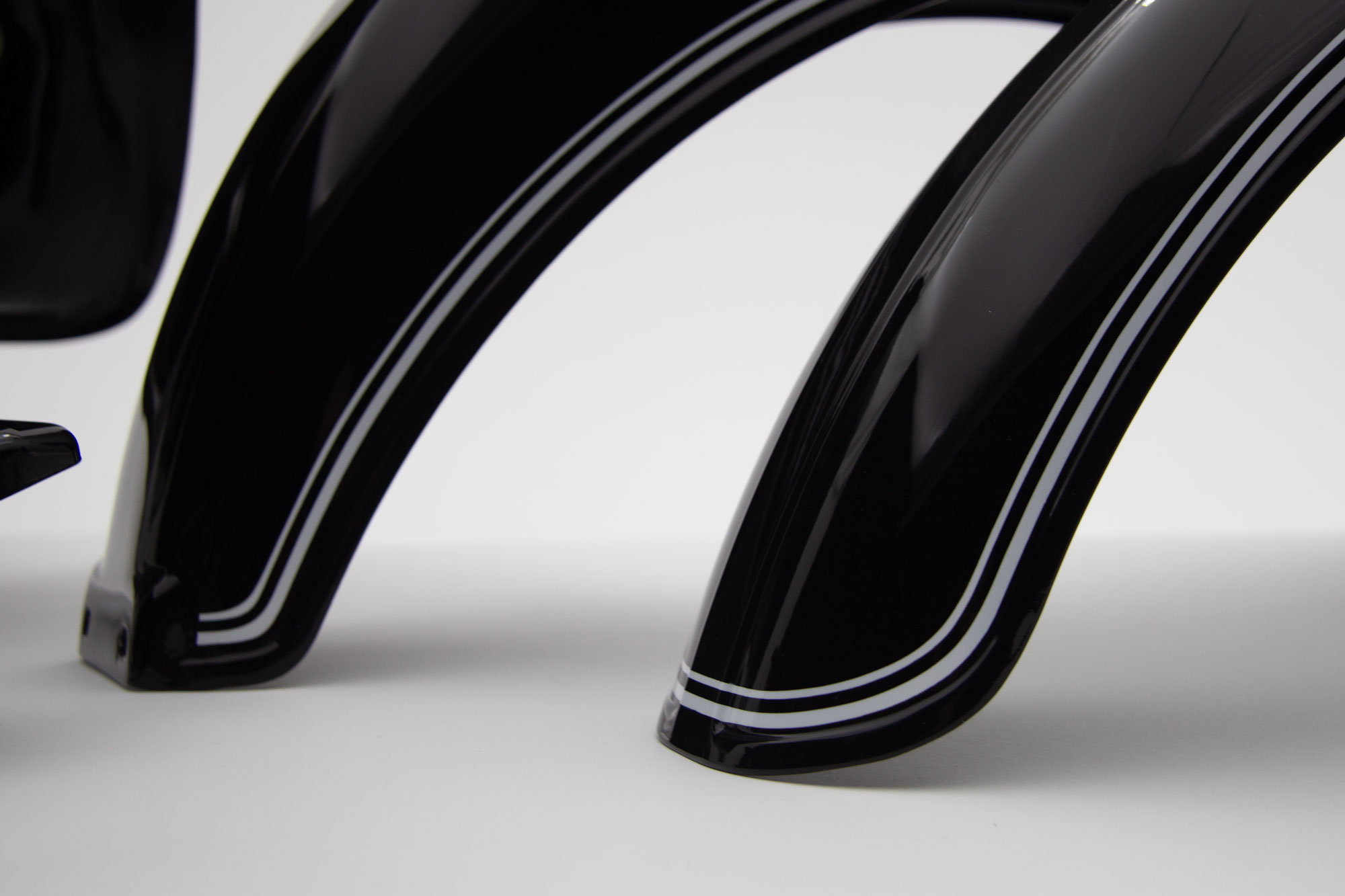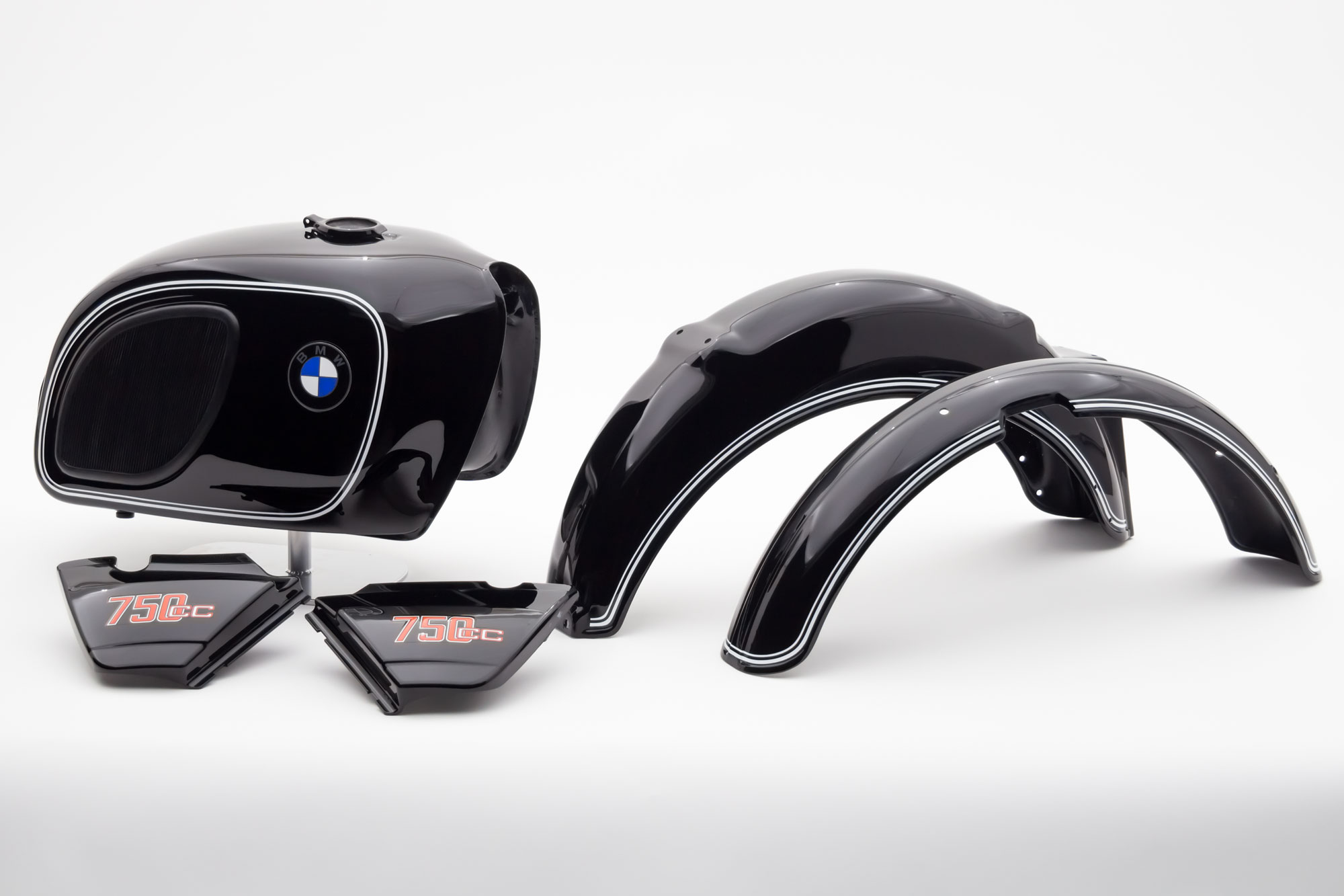 The fenders and side covers were also taken back to bare material, corrected where needed, and prepped for refinishing. We repainted the full set in the original black with white double pinstripes, following the stock BMW layout. The stripes were hand-masked and painted before clearcoat to keep the lines sharp and true to the era.