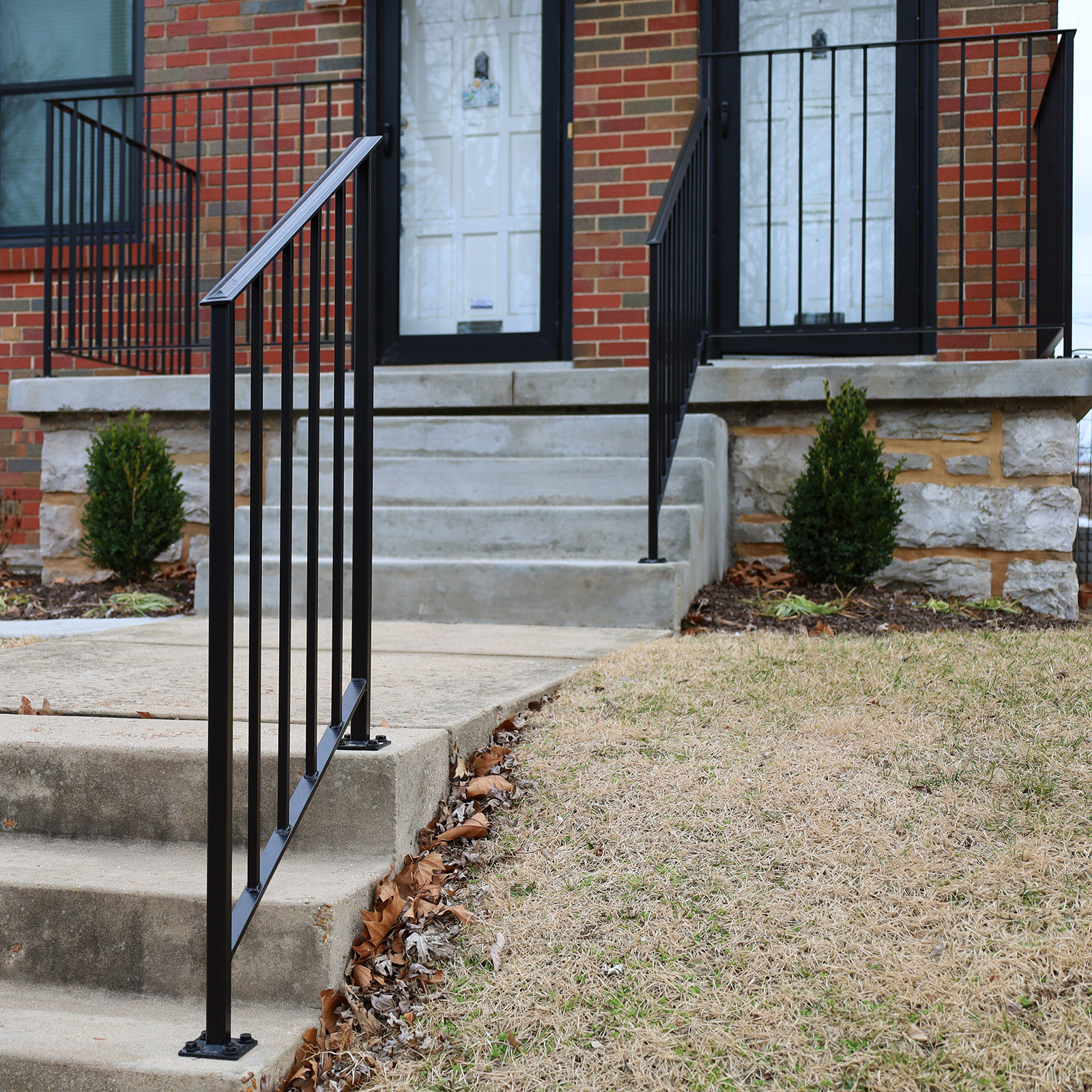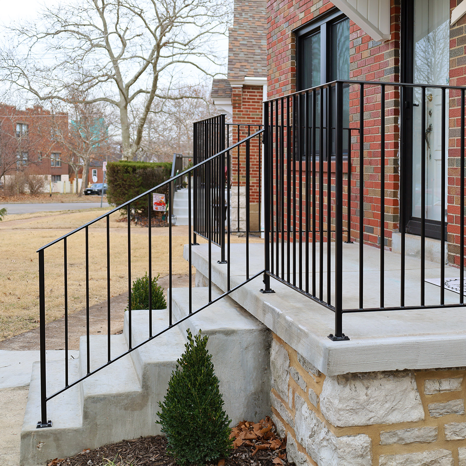 As part of a full exterior remodel of a two-family brick home in South St. Louis, we fabricated and installed custom steel railings for the new front porch platform and concrete stairs.