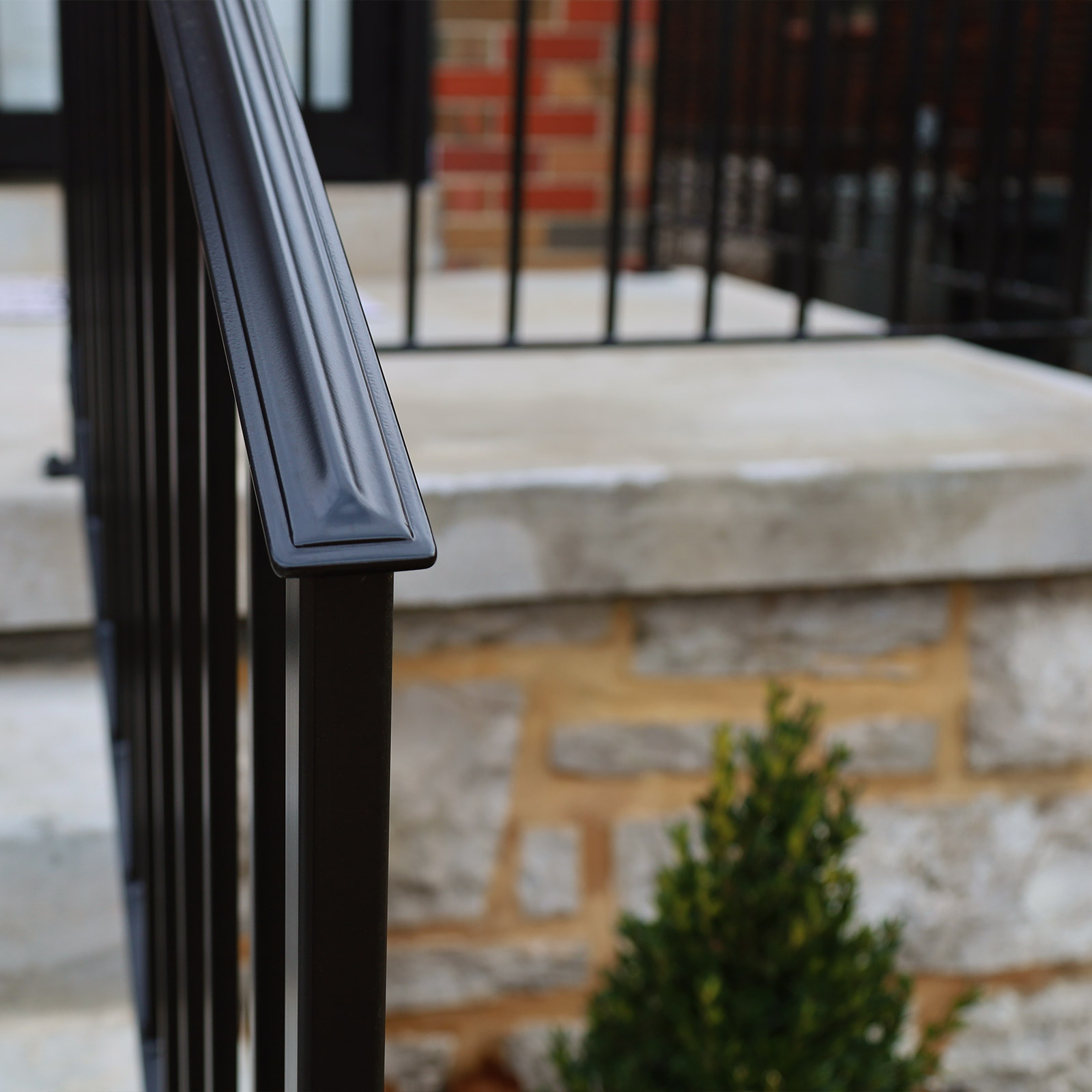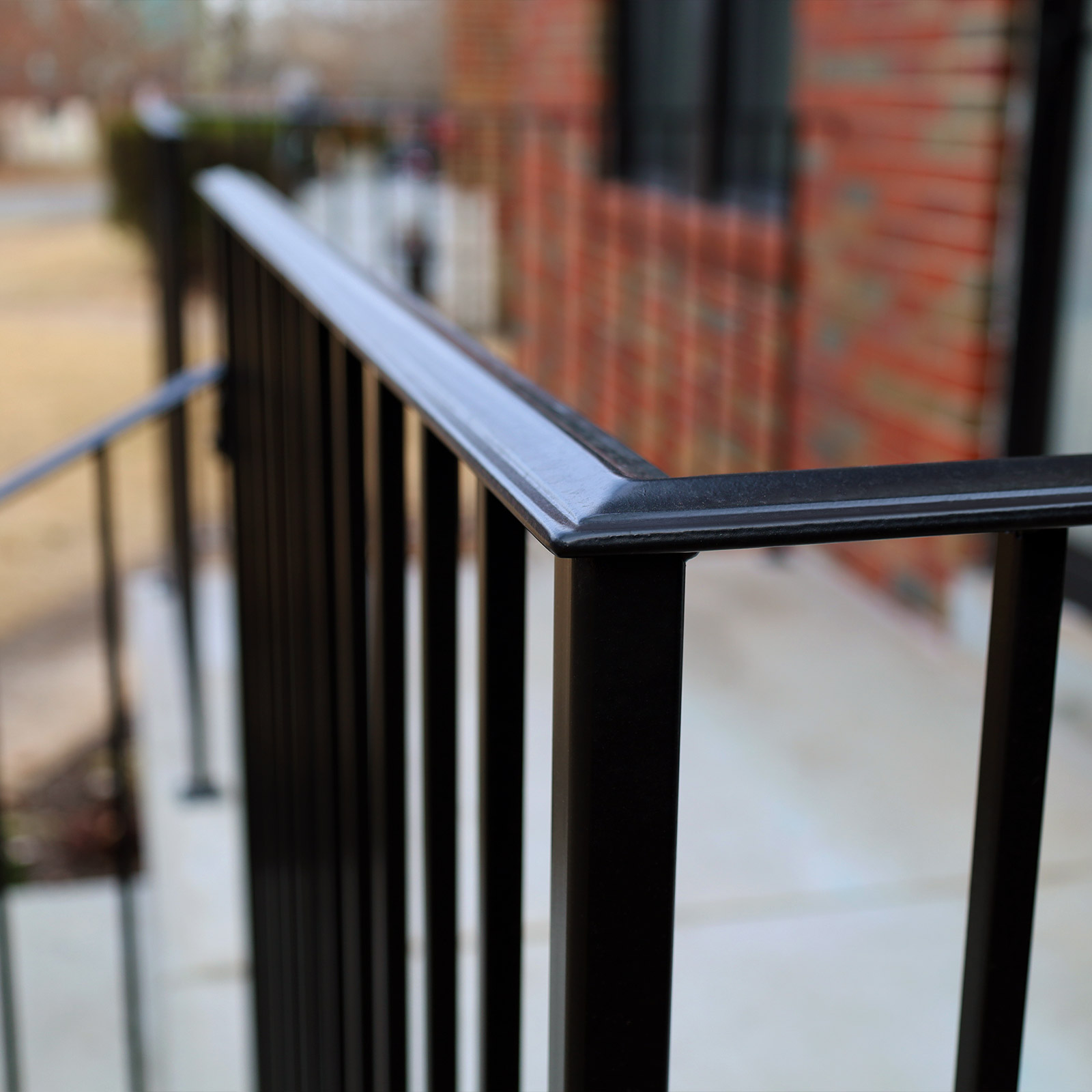 Powder coated steel stair railing with clean vertical balusters and classic proportions.