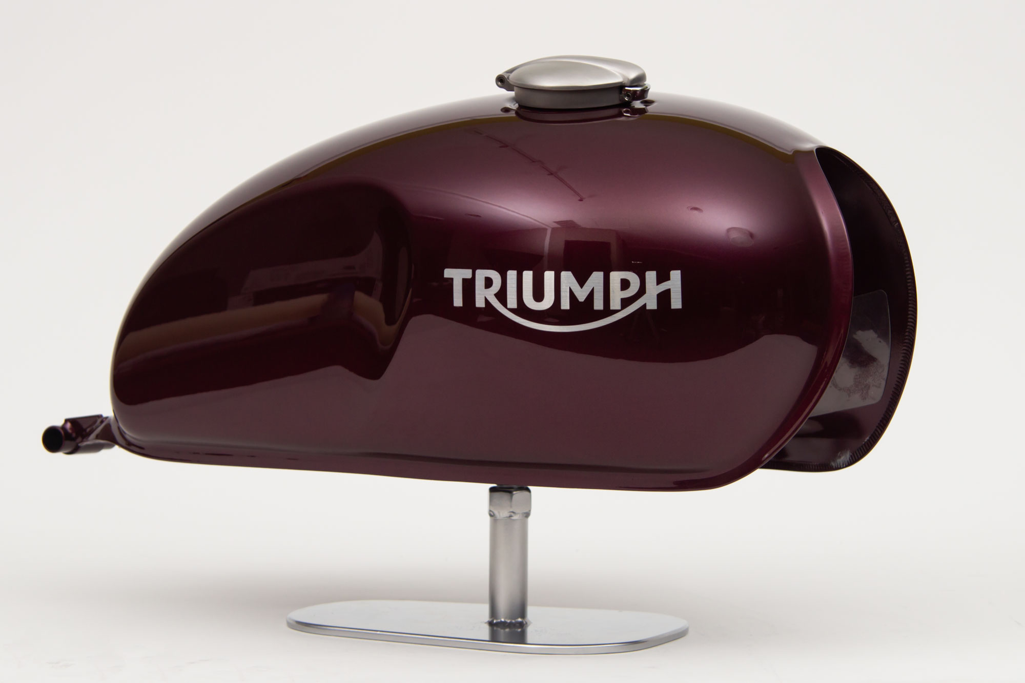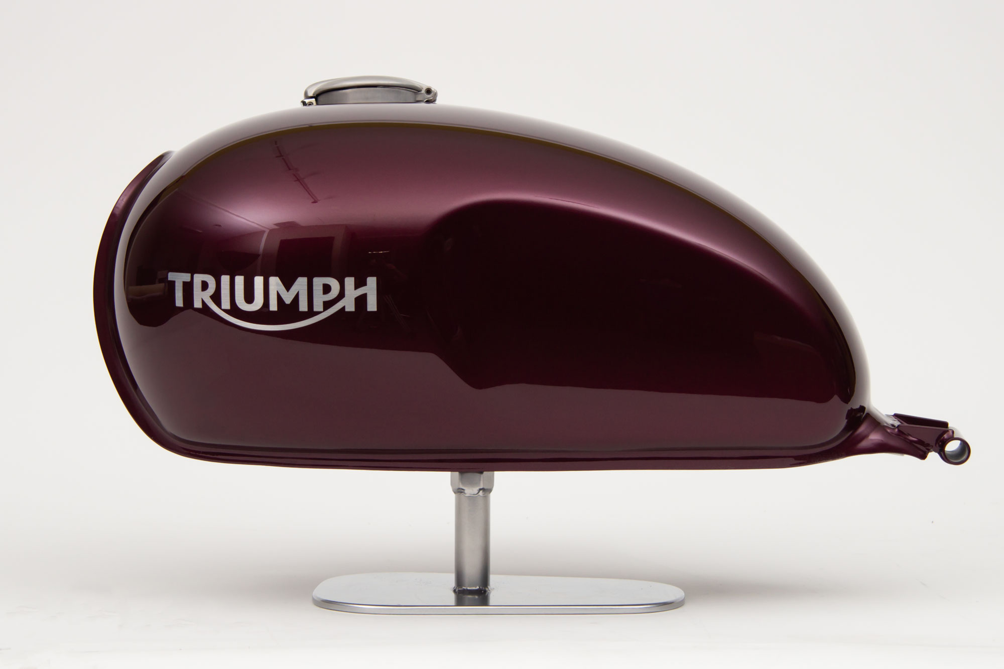 We refinished this Triumph Speed Twin tank in Mulberry, a rich, wine-toned color that shifts subtly under light and highlights the tank’s classic lines. The depth in this finish comes from careful prep and a high-quality automotive basecoat system laid down evenly and clean.