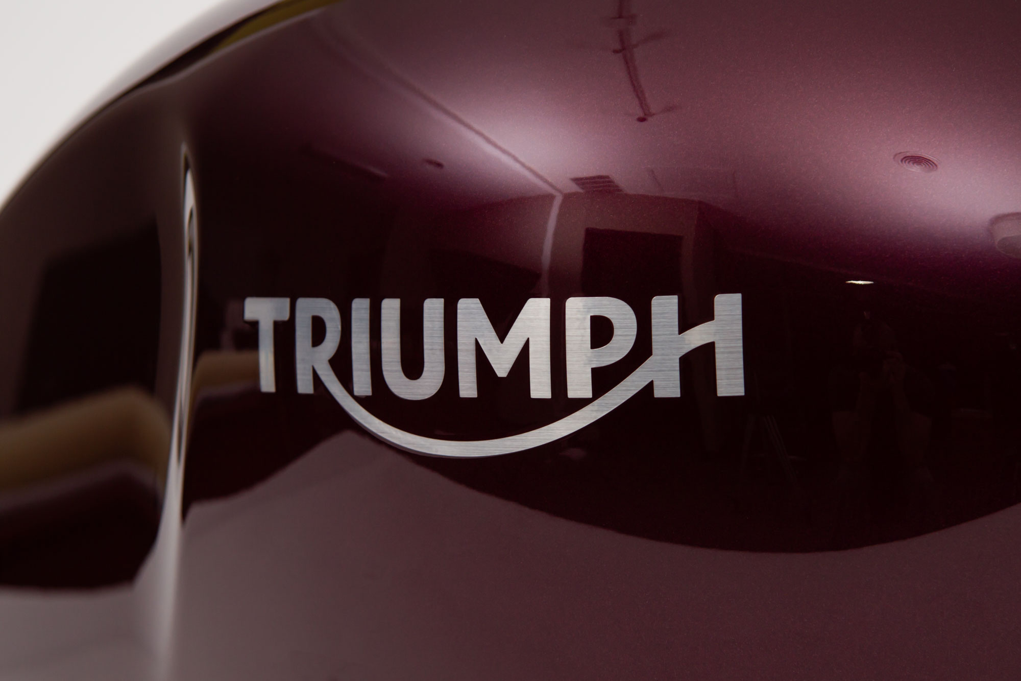 The brushed aluminum-style Triumph decal was applied beneath the clearcoat for a factory-integrated look with added durability. It reads crisp against the Mulberry and keeps the overall feel true to the Speed Twin’s heritage.